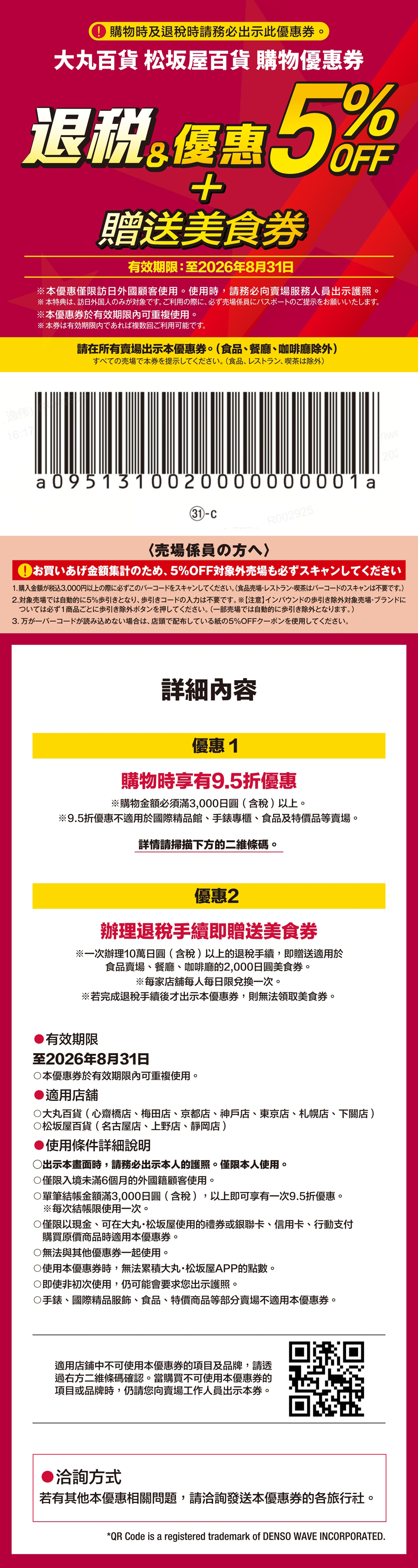 | 大丸松阪屋 優惠券 | 點擊下載 | 享額外 5% 優惠折扣 + 10% 免稅 + 美食券 |